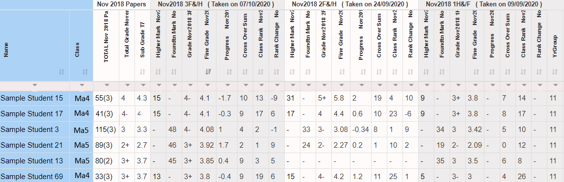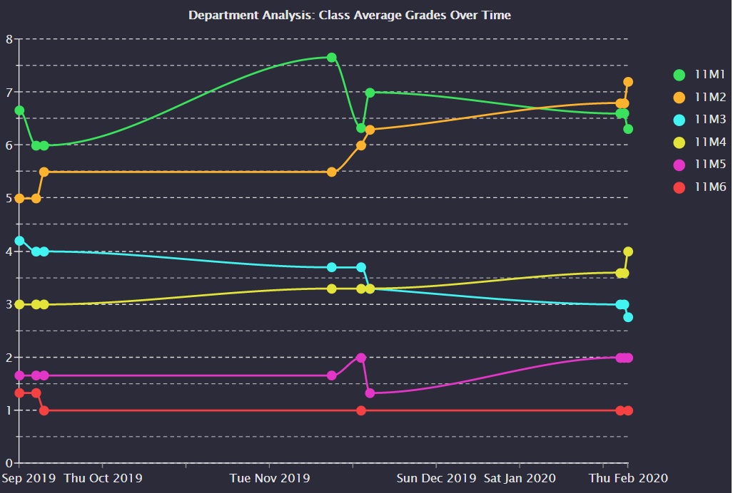 A graph detailing the average grade of the class overtime in order to ascertain which classes are doing well and which need support, as well as looking out for trends such as drops for non-calc papers or certain papers. Plotting the average grade (rather than marks) also allows the comparison between higher and foundation classes and when a cross-over class takes papers from both tiers.