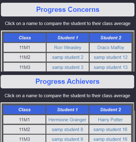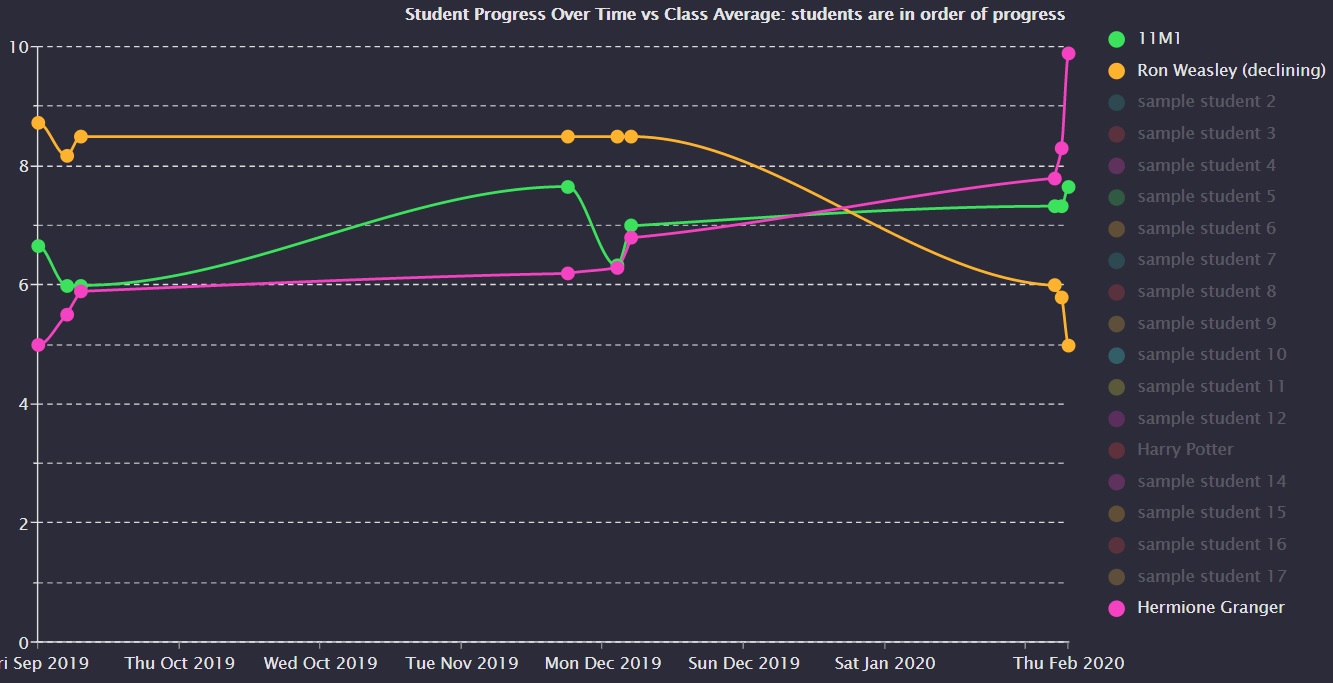 On the data dashboard for each class we identify two students are declining the most and two that are improving the fastest. You can click on their name to see their individual graph vs the class average. We run an algorithm along every student's time series to identify these students and you can compare them to other students using our graph above showing all student's time series.